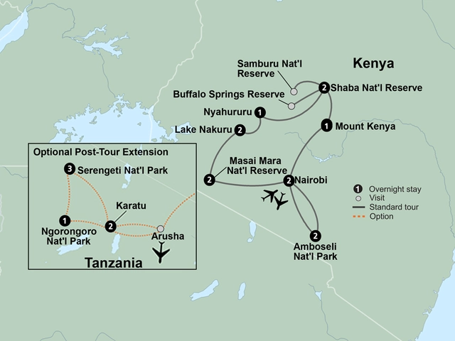 Enjoy Kenya's scenic vistas and magnificent wildlife as you traverse the African plains on an intimate safari adventure. In Swahili, “safari” means journey; to you, it will mean that - and so much more. Explore Kenya, home to incredible wildlife, from cheetahs to wildebeests. Discover the thriving cultures and innumerable natural wonders that make this one of the most popular African countries to visit. Go in search of elephants, lions, buffalo, rhinos, and leopards - collectively known as the “Big 5” and other animals on 13 game drives. Meet a member of the Samburu tribe who opens you up to the culture, folklore, and African traditions. Visit with Rothschild giraffes at the Giraffe Sanctuary. Visit the beautiful Maasai Mara National Reserve, and top off a full day game drive with a traditional dinner in the bush and a Maasai dance performance. These are the plains of Africa, where unparalleled experiences greet you at every turn.